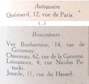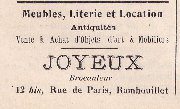 Seul Joyeux, rue de Paris (rue de Gaulle) à Rambouillet, tout en s’affirmant « brocanteur » introduit dans sa publicité de 1910 le terme accessoire d’« antiquités ».