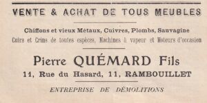 Lorsque la rubrique « antiquaires » apparait dans l’annuaire commercial de Rambouillet de 1930, Pierre Quemard est le premier à la revendiquer. Cette année là, ses anciens collègues, Vve Bonhomme, Chauveau Lecouteux et Jourde continuent à se dire « brocanteurs ».