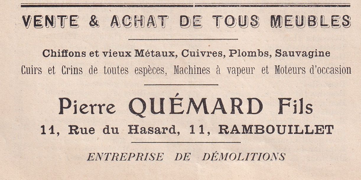 On peut supposer que Quemard a cependant conservé l’essentiel de son activité de brocante. Il a d’ailleurs conservé ses locaux de la rue du Hasard (Maurice Dechy), mais ouvert sa nouvelle boutique rue de Paris (R.Poincaré). Son changement de catégorie indique à sa clientèle qu’à côté de vieux meubles et objets, il en propose qui sont anciens. Il leur fait en outre savoir qu’il possède une connaissance en matière d’art pour les renseigner et les conseiller, et une vraie compétence pour effectuer une  restauration de qualité qui conservera à l’objet sa valeur patrimoniale.