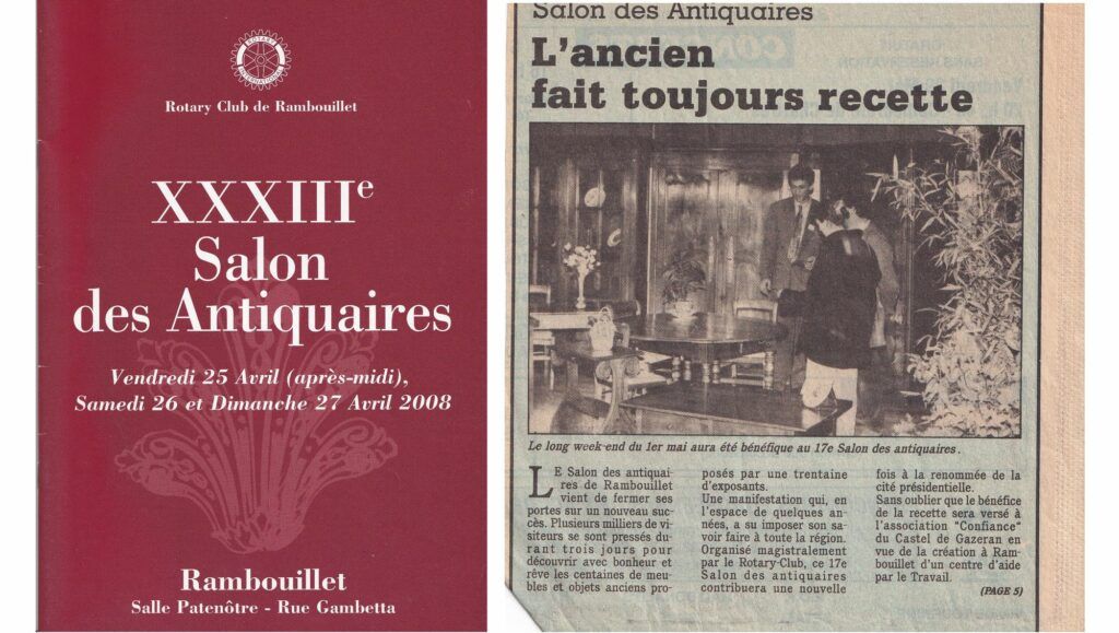 A Rambouillet, en 1975, le Rotary-club organise un premier salon des antiquaires, salle Patenôtre. Une trentaine d’exposants de qualité, la présence d’un expert pour vérifier les objets présentés et renseigner les visiteurs… le salon, qui est le second organisé dans les Yvelines après celui de Versailles, remporte un grand succès.