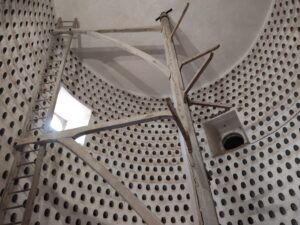 Pourquoi est-il surélevé sur une base qui crée une salle circulaire semi-enterrée ? Peut-être seulement pour qu’il soit plus majestueux, et visible de plus loin ?