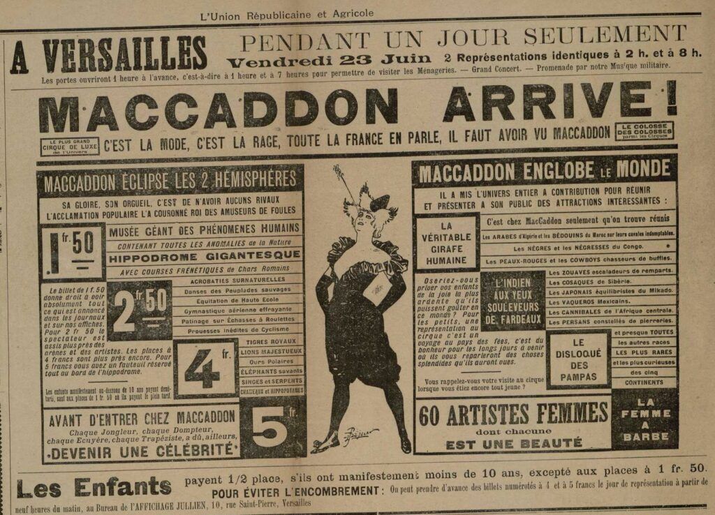 En 1905 le cirque américain Maccaddon, crée par un ancien directeur de Barnum, présente la même démesure. Celui qui s’intitule modestement « Le plus grand cirque de luxe de l’univers » entreprend une tournée en France. Il se déplace en chemin de fer, avec 4 trains spéciaux et 76 wagons. Son chapiteau peut accueillir 12 000 spectateurs.