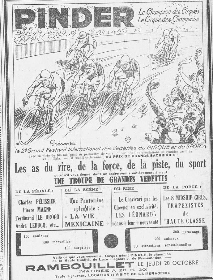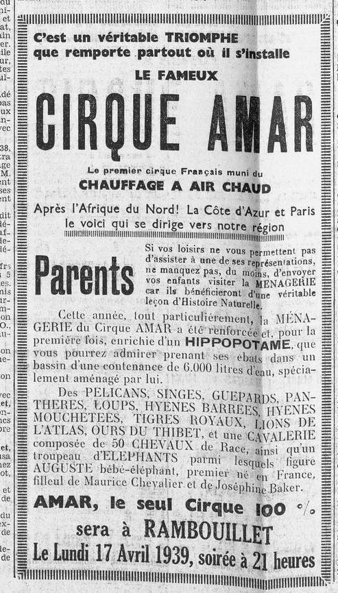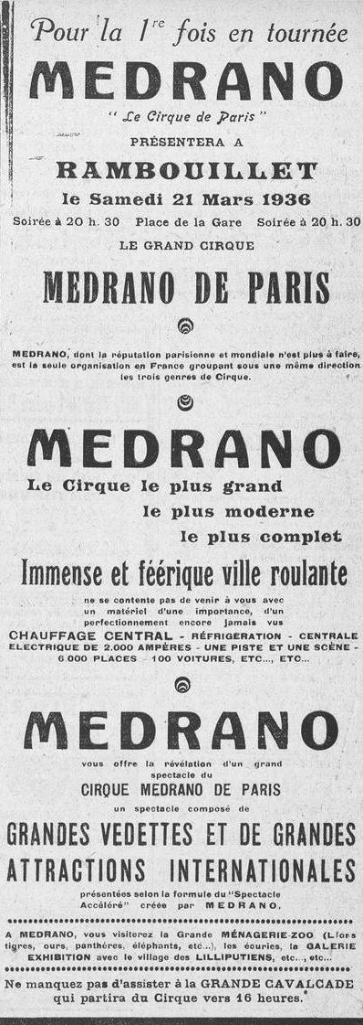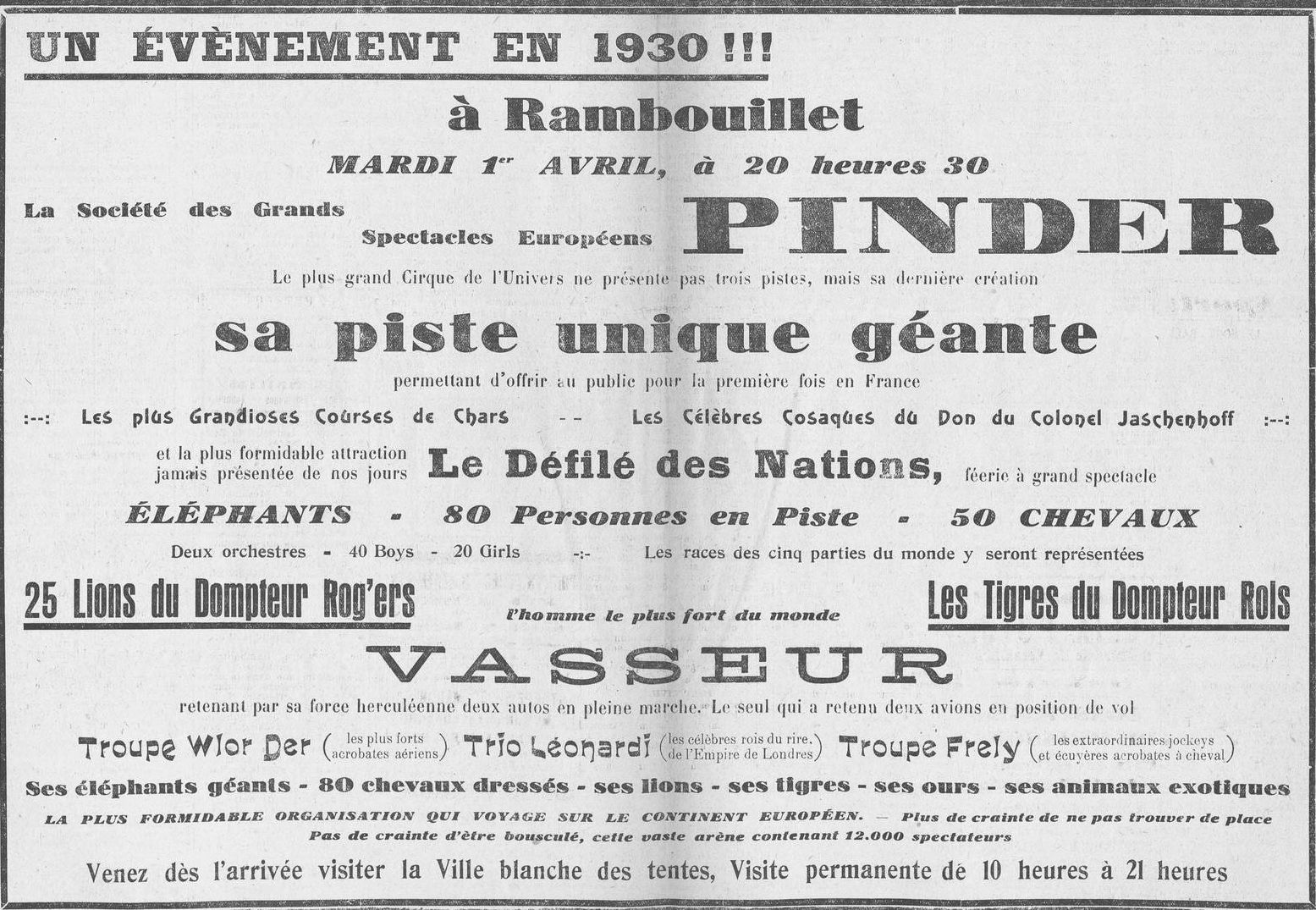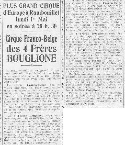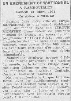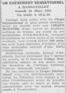 Je joins l’annonce du passage (1931) d’un Cirque International, « monstre » au « programme colossal », sur lequel je n’ai trouvé aucune autre information, mais qu’il ne faut surtout pas confondre avec les autres cirques passés à Rambouillet, comme nous le conseille sa direction !