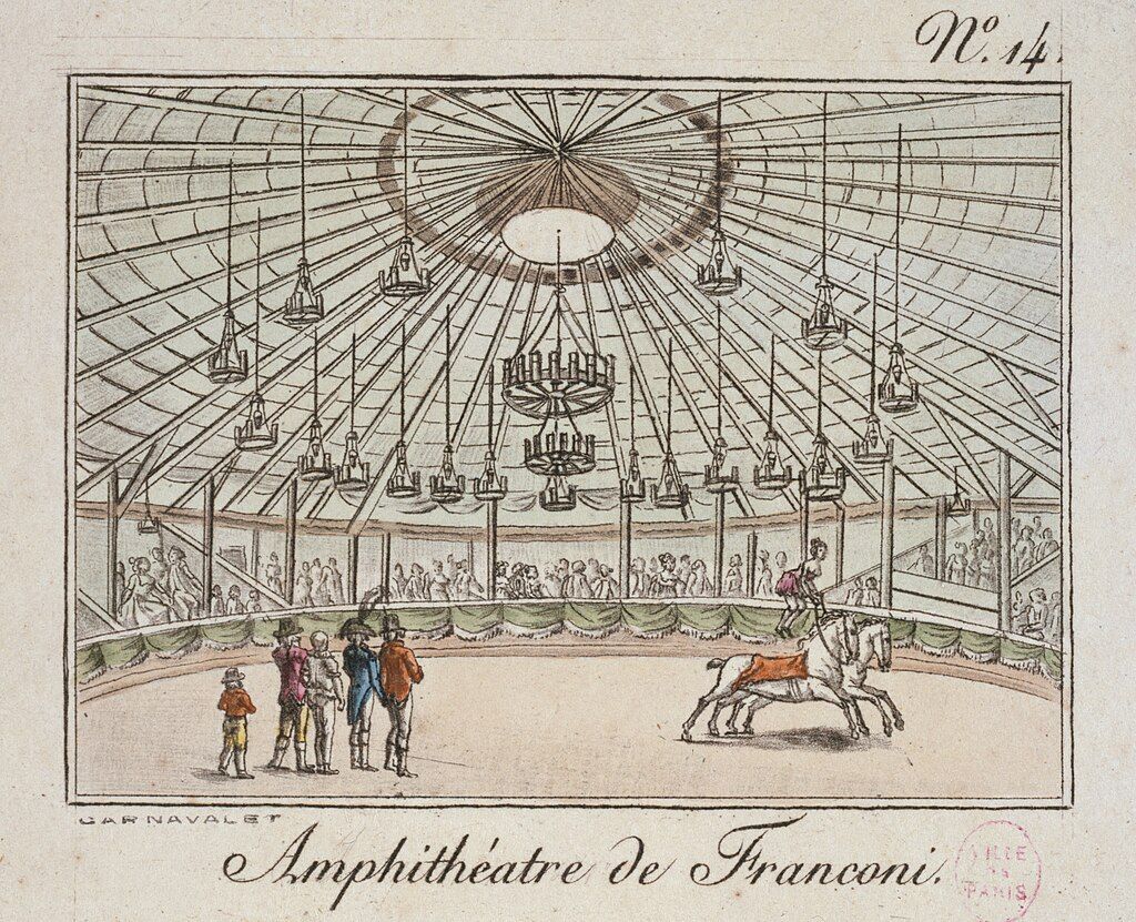En 1807 les frères Franconi ouvrent leur premier Cirque Olympique à Paris. Sur une piste circulaire de 17m de diamètre, entourée de six rangées de gradins, ils présentent de « grands exercices d’équitation, de danse et de voltige sur les chevaux exécuté par la troupe des citoyens Franconi fils… ». Au fil des ans ils y ajoutent des numéros originaux, des animaux exotiques, comme l’éléphant Baba qui débouche une bouteille, attrape avec sa trompe des pommes lancées au vol et tourne la manivelle d’un orgue de Barbarie…