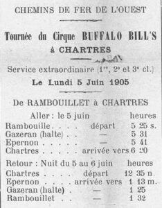 Pas question de recevoir à Rambouillet des cirques aussi gigantesques. Cependant les Rambolitains peuvent aller voir le cirque Buffalo Bill’s à Chartres, en profitant d’un train spécialement affrété à cet effet le 5 juin 1905 !