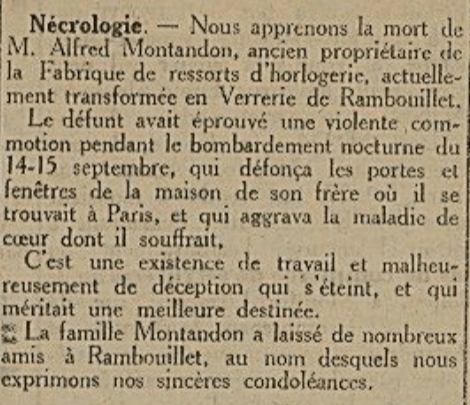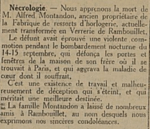 Le 28 février 1919, c’est par une annonce nécrologique publiée dans « la Presse Rambolitaine » que les Rambolitains apprendront le décès d’Alfred Montandon. En fait ce décès remonte au 18 septembre 1918, quelques jours après un bombardement de la capitale, mais c’était la guerre, et personne n’avait cru bon d’en informer la ville dans laquelle Montandon n’avait pas conservé d’attaches.