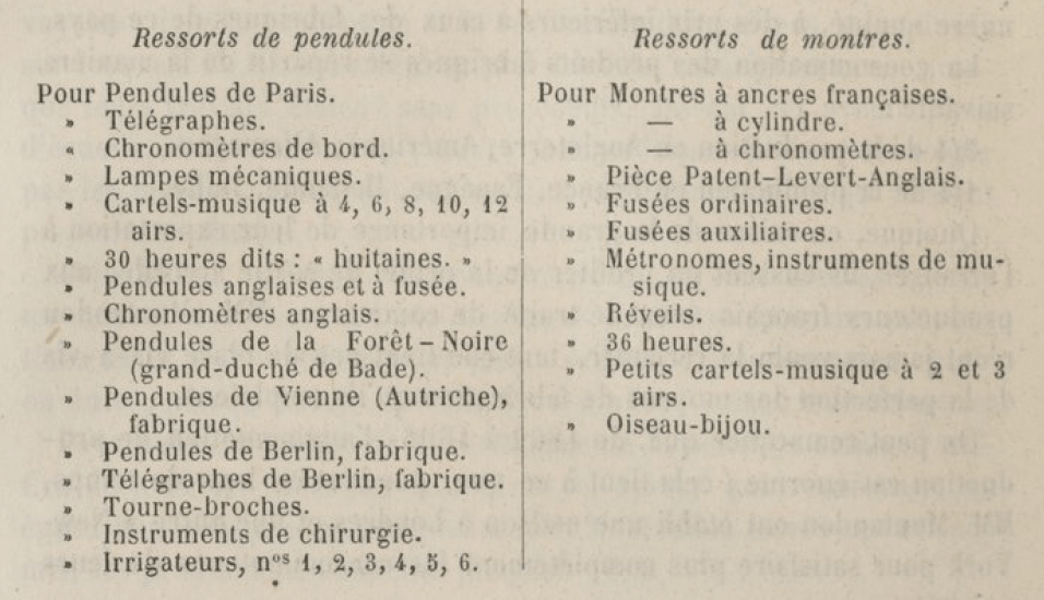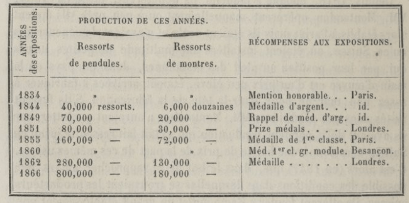 Deux ans après, ils y produisent 70 000 ressorts de pendule et 20 000 douzaines de ressorts de montre, et en 1866, 800 000 ressorts de pendule et 180 000 douzaines de ressorts de montre.