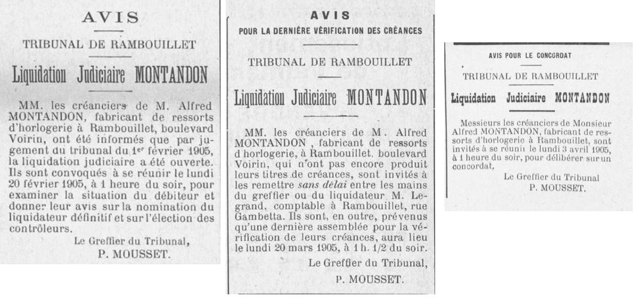 Un concordat est finalement accepté par les créanciers et l’entreprise aurait ainsi pu reprendre son activité, mais Alfred Montandon réalise qu’il ne pourra pas redresser l’entreprise, et respecter le plan d’apurement du passif qui a été négocié avec les fournisseurs. Il se résout donc à chercher un repreneur. Le 1er mai 1905 le fonds de commerce des Ressorts Montandon est cédé à un industriel parisien, Charles-Auguste Bertin.