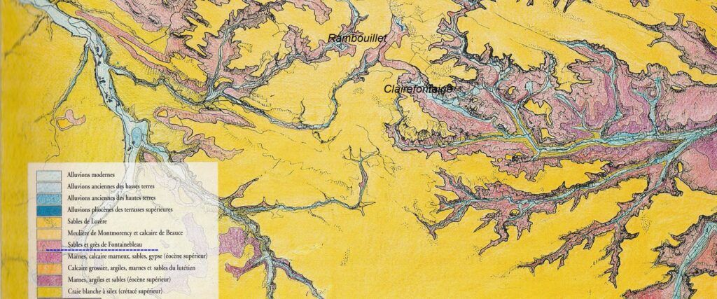 Si la mer ne s’était pas retirée, il y a environ 33 millions d’années, Rambouillet pourrait être un port réputé, et les amis de la Nature demanderaient l’abolition de la pêche au lieu de se mobiliser  contre la chasse. Mais il faut voir le bon côté des choses : en se retirant elle a laissé des couches alternées de sable et de calcaire. Un sable, dit « de Fontainebleau » parce qu’il affleure particulièrement dans cette région, est particulièrement fin. Il est clair et d’une très grande pureté : 95% à 97% de silice .