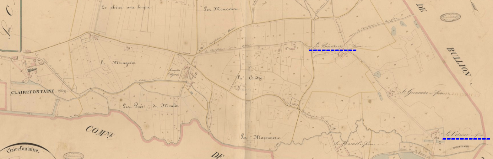Sur le plan cadastral de 1828 on voit que ce domaine, situé à la sortie de Clairefontaine, comprenait autrefois deux fermes, de la Béniterie et de la Voisine.